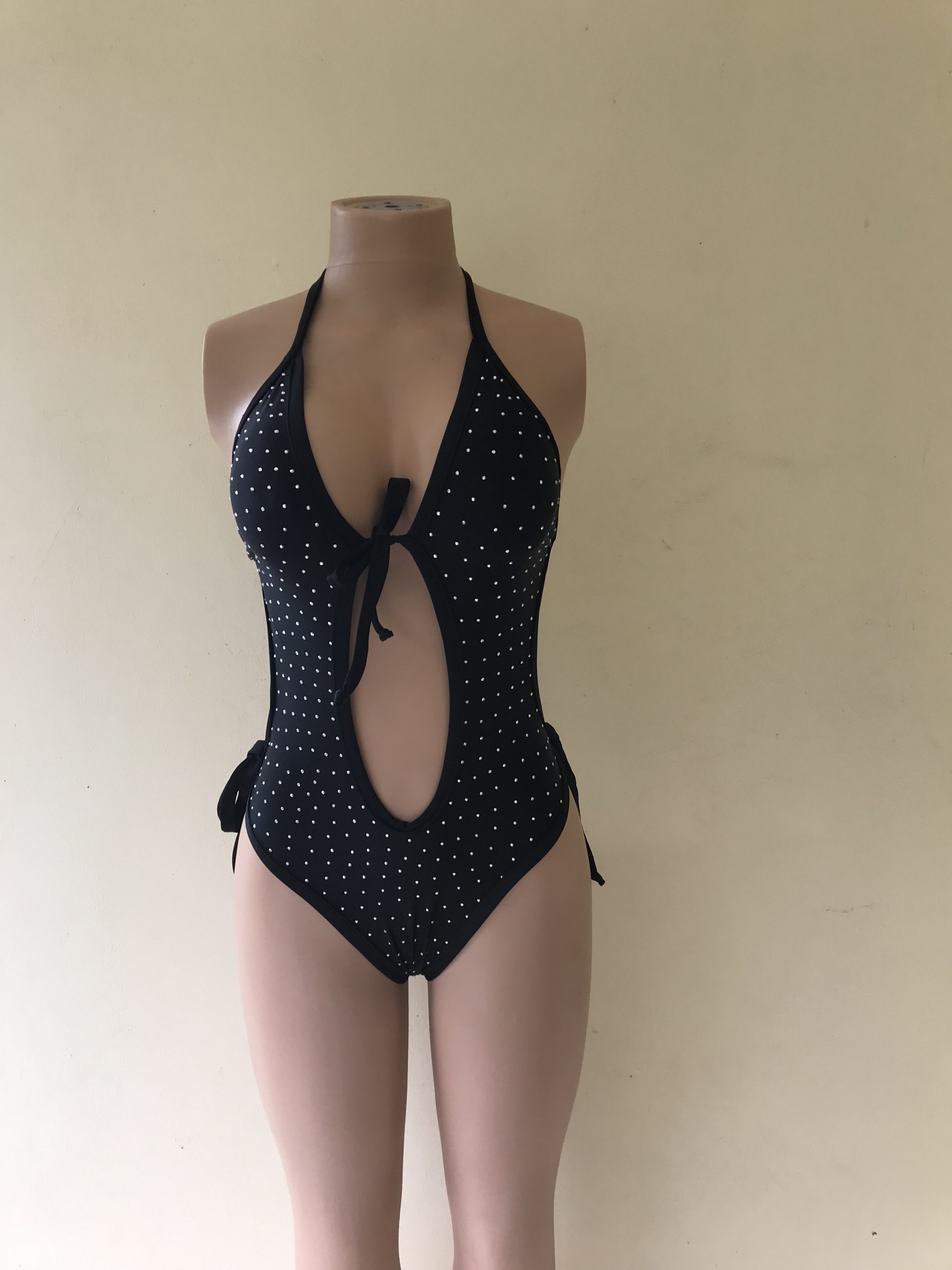 Ignite the night in Charcoal Fire — a rhinestone-studded black cut-out one-piece with side ties and a daring thong back.