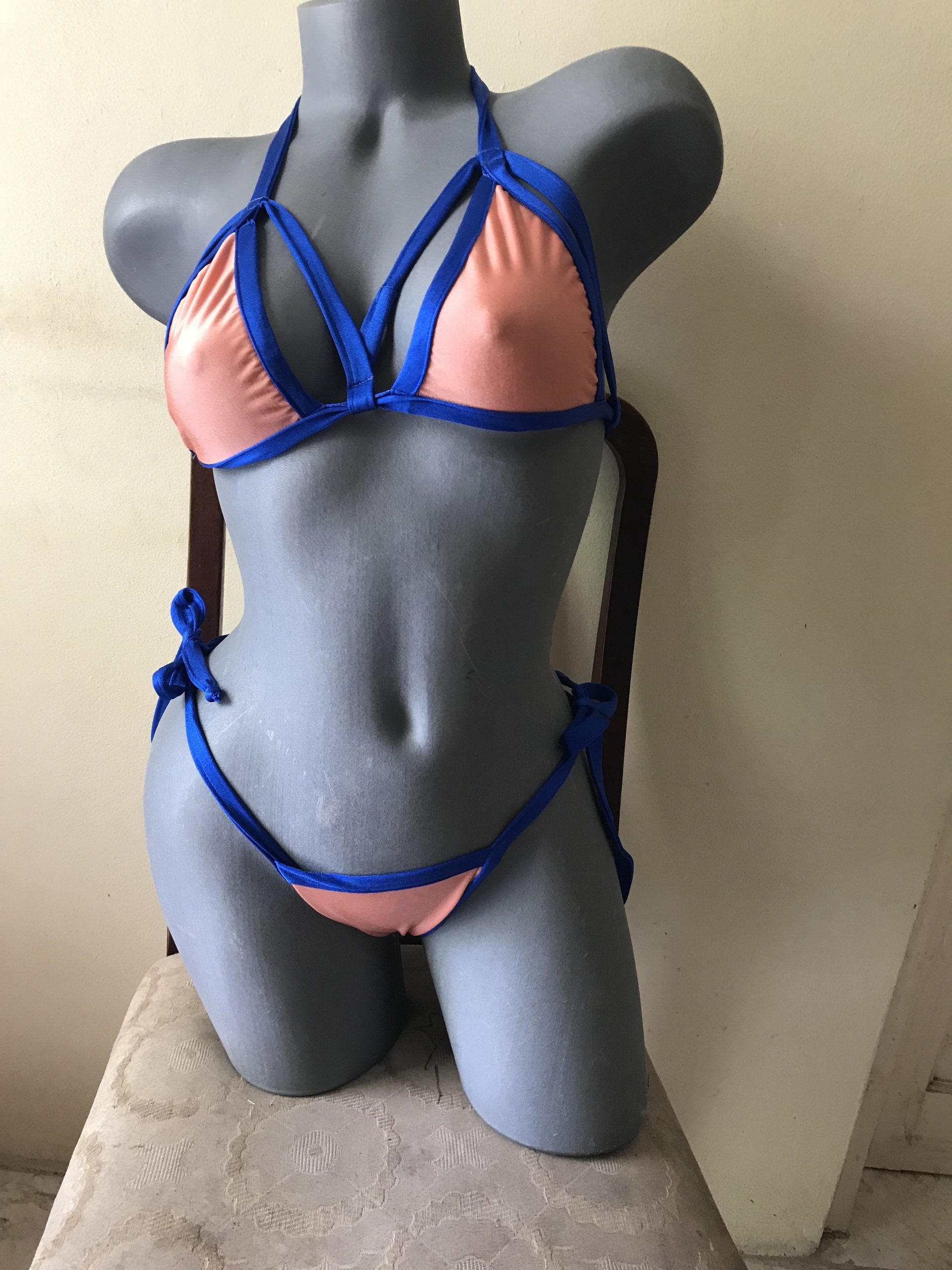 Turn up the heat with this peach strappy bikini, accented with bold blue trim for a sleek, high-contrast look that’s perfect for poolside or stage.