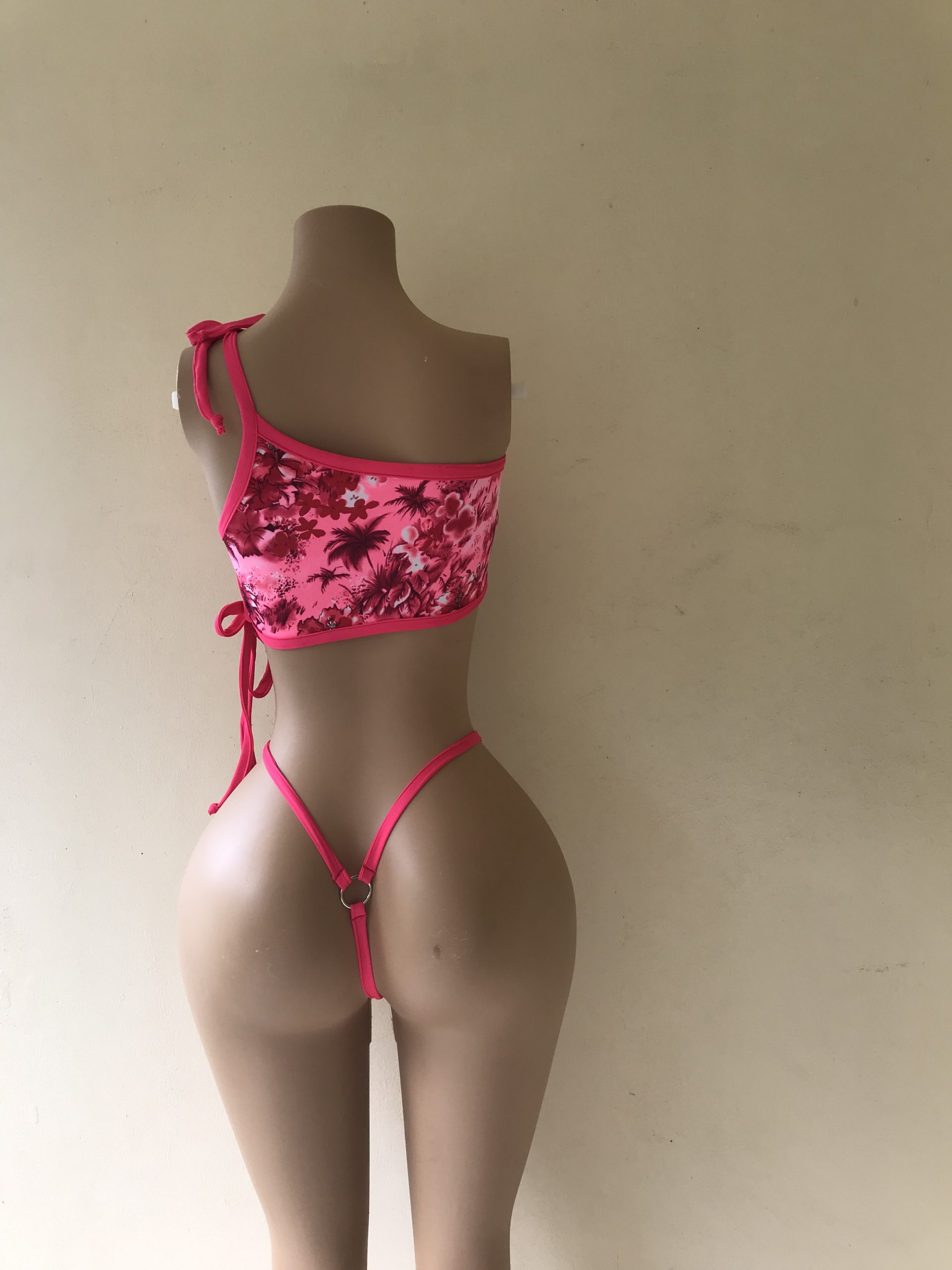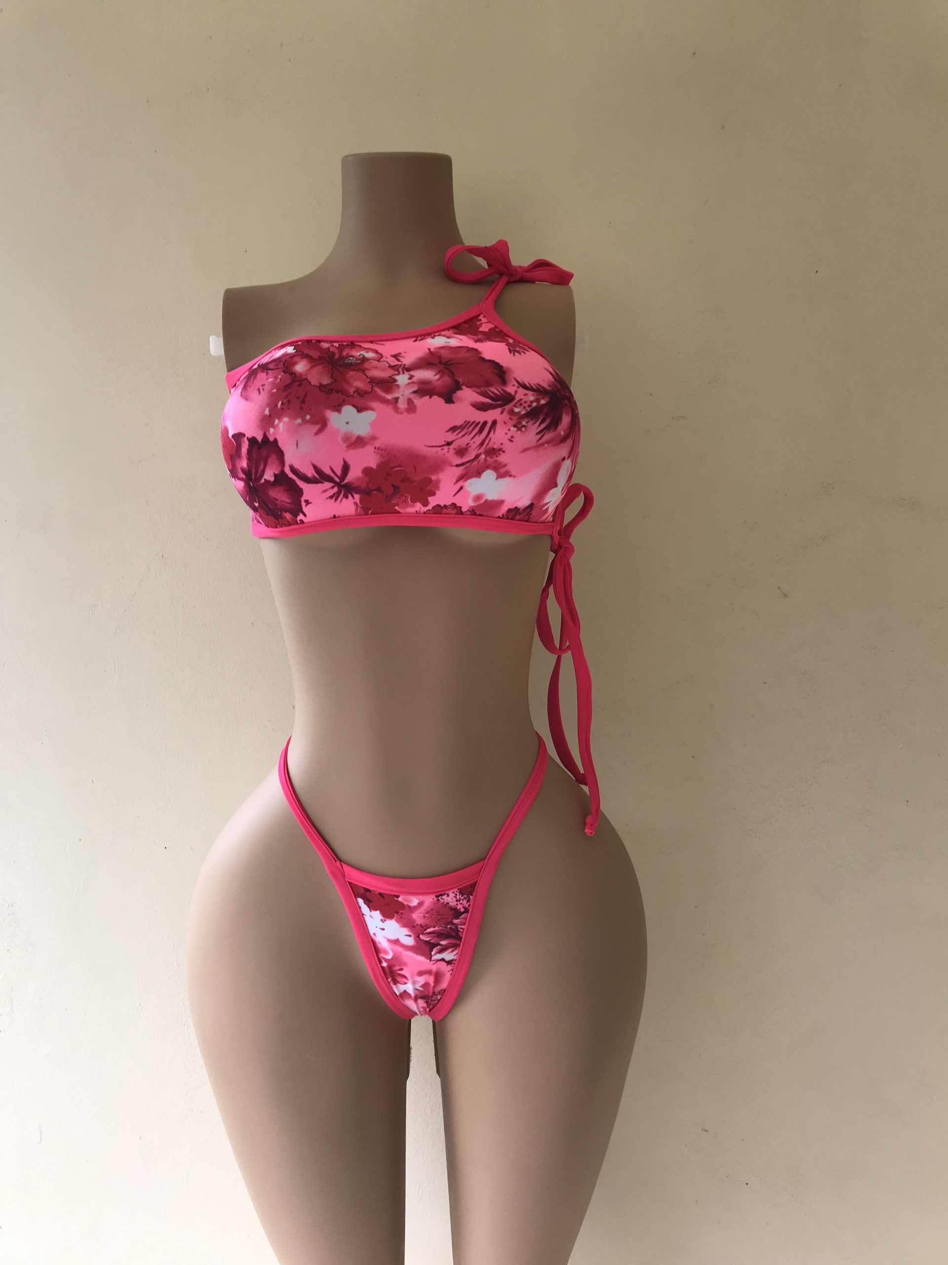 - Two-piece bikini with one-shoulder top and thong bottom