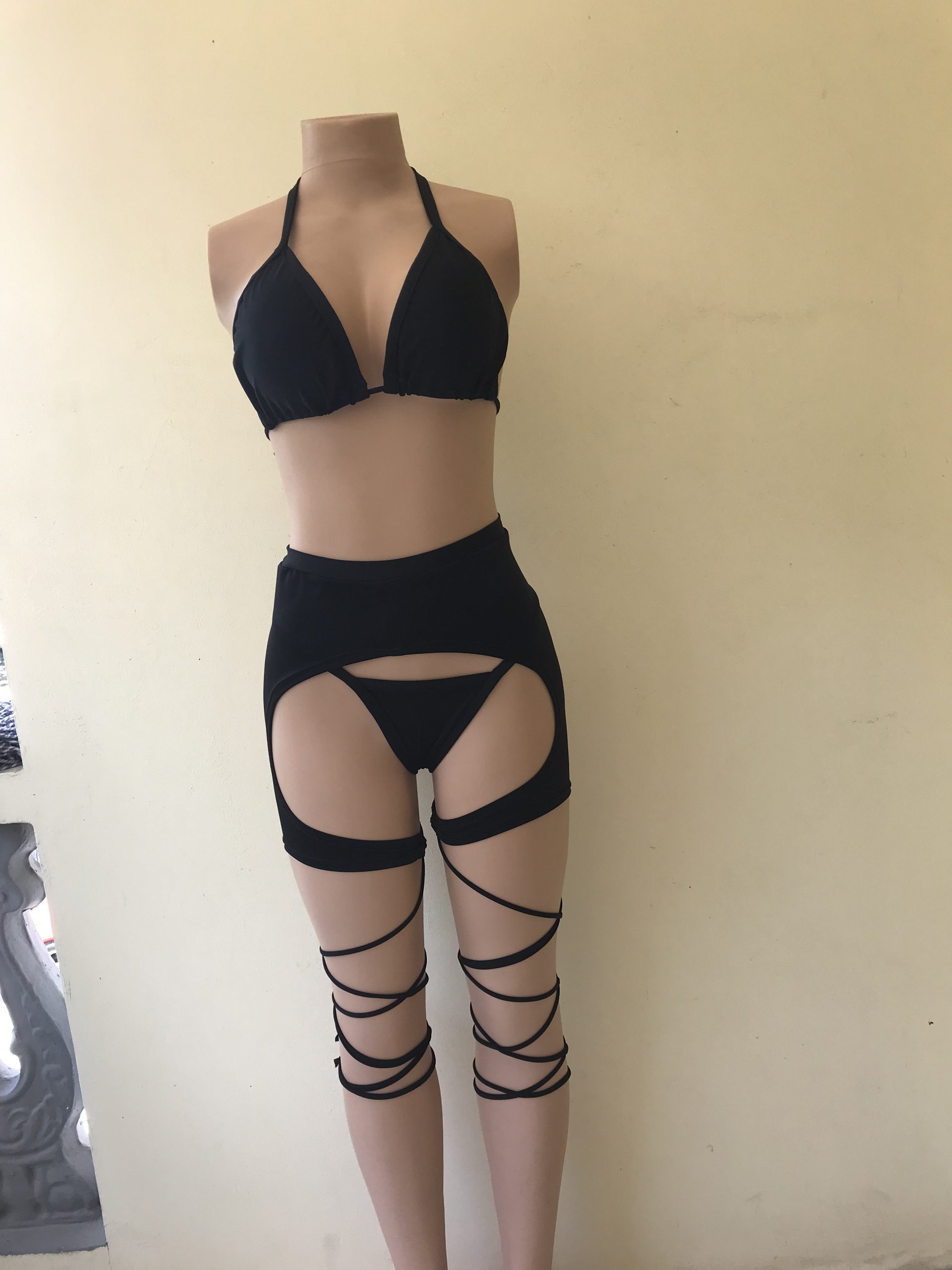 • Strappy leg ties wrapping around thighs and calves for a dramatic finish.